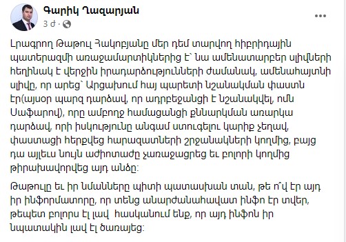 Լրագրող Թաթուլ Հակոբյանը մեր դեմ տարվող հիբրիդային պատերազմի առաջամարտիկներից է` նա ամենատարբեր սլիվների հեղինակ է վերջին իրադարձությունների ժամանակ, ամենահայտնի սլիվը, որ արեց` Արցախում հայ պարետի նշանակման փաստն էր(այսօր պարզ դարձավ, որ ադրբեջանցի է նշանակվել, ոմն Սաֆարով), որը ամբողջ համացանցի քննարկման առարկա դարձավ, որի իսկությունը անգամ ստուգելու կարիք չեղավ, փաստացի հերքվեց հարազատների շրջանակների կողմից, բայց դա այլեւս նույն աժիոտաժը չառաջացրեց եւ բոլորի կողմից թիրախավորվեց այդ անձը։