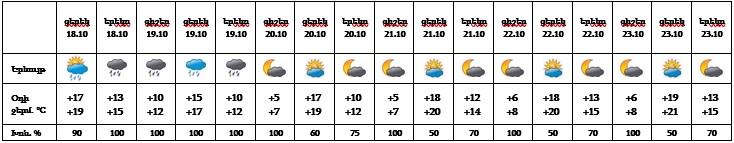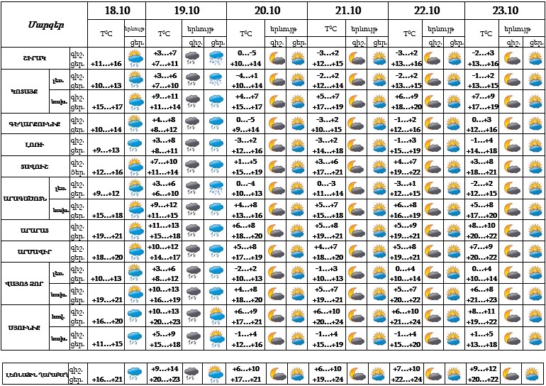 Մարզերում հոկտեմբերի 18-ի ցերեկը, հոկտեմբերի 19-ին շրջանների զգալի մասում սպասվում են տեղումներ և մառախուղ, 19-ին առանձին լեռնային շրջաններում՝ թաց ձյան տեսքով։ Հոկտեմբերի 19-ին առանձին վայրերում տեղումները կլինեն ինտենսիվ։ Հոկտեմբերի 20-23-ը կլինի առանց տեղումների եղանակ։ Քամին՝ հարավարևմտյան 2-6 մ/վ: