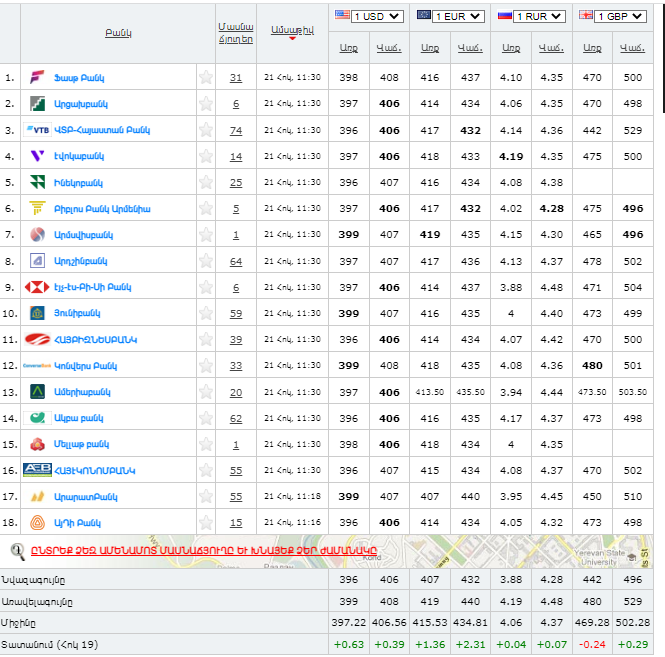 ԱՄՆ դոլարի առքի առավելագույն արժեքն է 399 դրամ վաճառքի նվազագույն արժեքը` 406 դրամ։