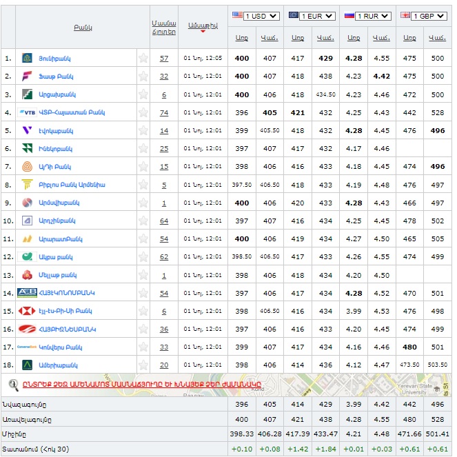 ԱՄՆ դոլարի առքի առավելագույն արժեքն է 400 դրամ, վաճառքի նվազագույն արժեքը` 405 դրամ։