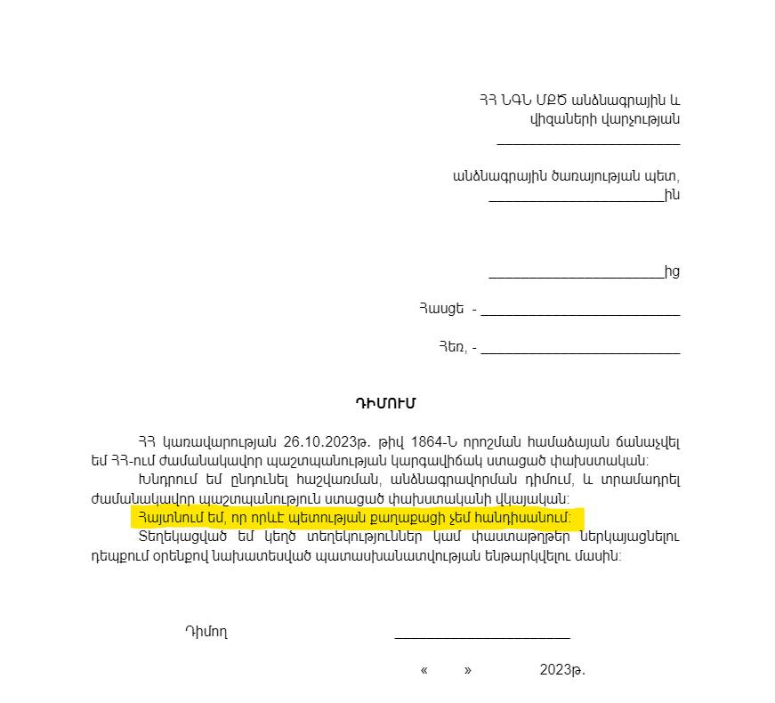 Արցախից բռնի տեղահանված մեր հայրենակիցներին ներկայացվող դիմումի մեջ ՊԱՐՏԱԴՐՎՈՒՄ Է ստորագրել, որ տվյալ անձը ՈՐևԷ ՊԵՏՈՒԹՅԱՆ ՔԱՂԱՔԱՑԻ ՉԷ․․․ ։