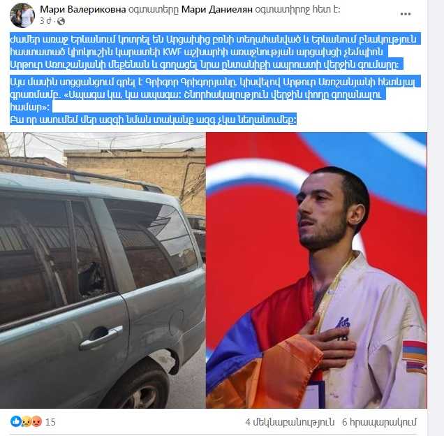 Ժամեր առաջ Երևանում կոտրել են Արցախից բռնի տեղահանված և Երևանում բնակություն հաստատած կիոկուշին կարատեի KWF աշխարհի առաջնության արցախցի չեմպիոն Արթուր Առուշանյանի մեքենան և գողացել նրա ընտանիքի ապրուստի վերջին գումարը: