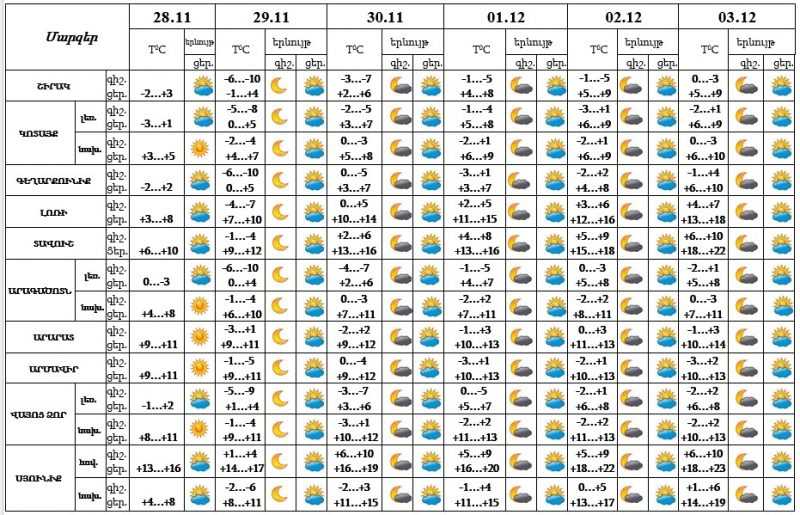 Նոյեմբերի 28-ի ցերեկը, 29-30-ին, դեկտեմբերի 1-3-ին սպասվում է առանց տեղումների եղանակ։