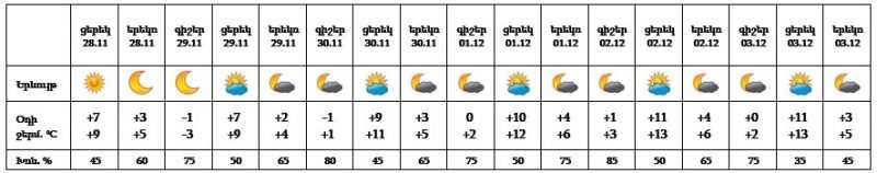 Օդի ջերմաստիճանը նոյեմբերի 28-ի ցերեկը կնվազի 4-6 աստիճանով, նոյեմբերի 30-ին, դեկտեմբերի 1-3-ին աստիճանաբար կբարձրանա 10-12 աստիճանով, Արարատյան դաշտում և Երևանում 4-5 աստիճանով։