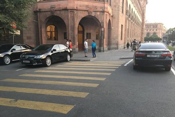 Սա Հանրապետության հրապարակում գտնվող Ֆինանսների նախարարությունն է, իսկ այս երկու մեքենաները՝ ֆինանսների նախարարի և փոխնախարարի ծառայողական ավտոմեքենաներն են, որոնք ամեն օր, օրենքի կոպտագույն խախտմամբ կայանված են հետիոտնի անցումին կպած: Այսպիսով նրանք փակում են տեսանելիությունը, և այս աշխույժ տուրիստական և հանրային հատվածում սա մի օր բերելու է ողբերգության: Չգիտեմ՝ գիտակցաբար թե ոչ, բայց այսպիսով նախարարը և փոխնախարարը, խախտելով օրենքը, ամեն օր վտանգի են ենթարկում հարյուրավոր քաղաքացիների կյանքը: