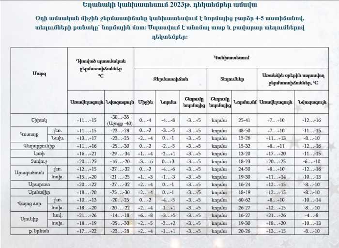 «Հիդրոօդերևութաբանության և մոնիթորինգի կենտրոն»-ի տնօրենի տեղակալԳագիկ Սուրենյանը ֆեյսբուքյան իր էջում գրել է. «Հայհիդրոմետը տեղեկացնում է. դեկտեմբերին օդի ամսական միջին ջերմաստիճանը կանխատեսվում է նորմայից բարձր՝ 4-5 աստիճանով, տեղումների քանակը` նորմային մոտ։