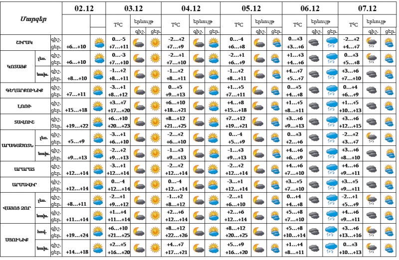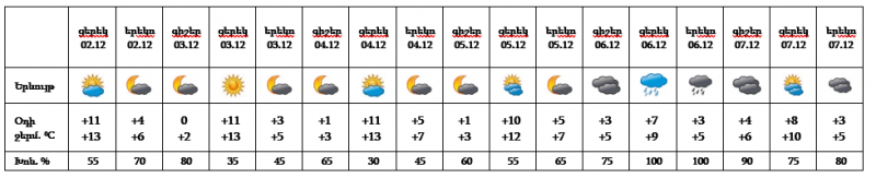 Դեկտեմբերի 3-5-ին, 6-ի գիշերը, 7-ի ցերեկը սպասվում է առանց տեղումների եղանակ։ Դեկտեմբերի 6-ի ցերեկը շրջանների զգալի մասում, 7-ի գիշերը առանձին շրջաններում սպասվում է անձրև և մառախուղ։ Քամին՝ հարավ-արևմտյան 2-5 մ/վ: Օդի ջերմաստիճանը, դեկտեմբերի 2-4-ին աստիճանաբար կբարձրանա 3-4 աստիճանով, Լոռիում, Տավուշում, Սյունիքում՝ 7-10 աստիճանով։