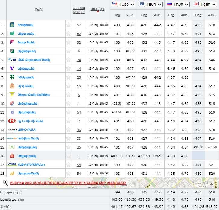 Հայաստանի Հանրապետության առևտրային բանկերը դեկտեմբերի 13-ին ԱՄՆ դոլարը գնում են 401.31 դրամ միջին կշռված գնով և վաճառում 407.64 դրամով, տեղեկանում ենք Rate.am կայքից: