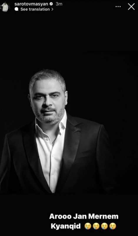 Երգիչ Սարոն Ինստագրամի սթորի բաժնում հրապարակել է Արա Մարտիրոսյանի լուսանկարը՝ գրելով․ «Արո ջան, մեռնոմ կյանքիդ»։