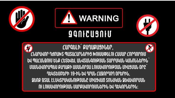 Չնայած Երևանի քաղաքապետարանի և աշխատանքներն իրականացնող կապալառու կազմակերպությունների կողմից ձեռնարկված անվտանգության միջոցառումներին, հնարավոր դժբախտ պատահարներից խուսափելու համար Երևանի քաղաքապետարանից հորդորում և պահանջում են հետևել անվտանգության տարրական կանոններին՝ մասնավորապես քաղաքի ամանորյա լուսավորության միացման օրը՝ դեկտեմբերի 19-ին և դրան հաջորդող օրերին, ձեռք չտալ էլեկտրականությանը միացված տոնական ձևավորման ու լուսավորության սարքավորումներին և դեկորներին։