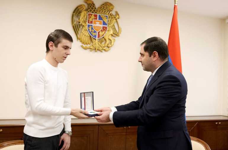 Նախարար Պապիկյանը բարձր է գնահատել նրա արարքը հայրենիքի սահմանների պաշտպանության գործում և հանձնել պետական պարգևը՝ Արիության մեդալը։