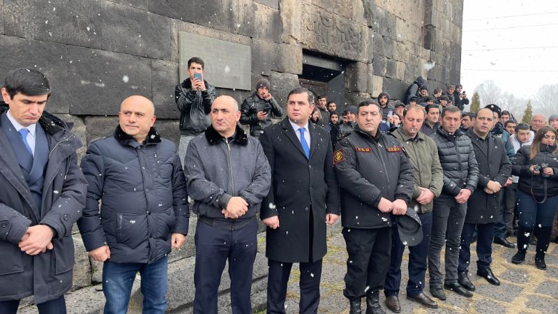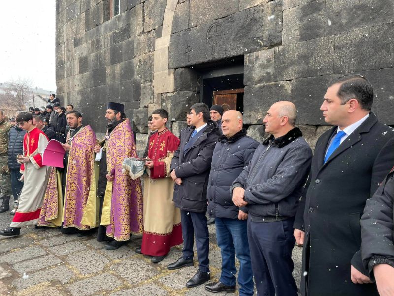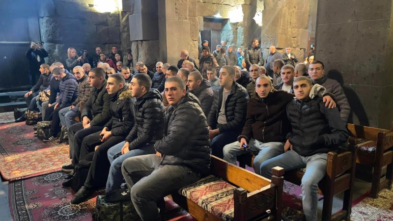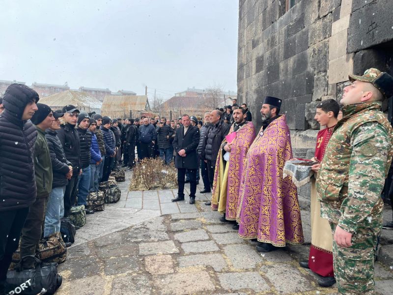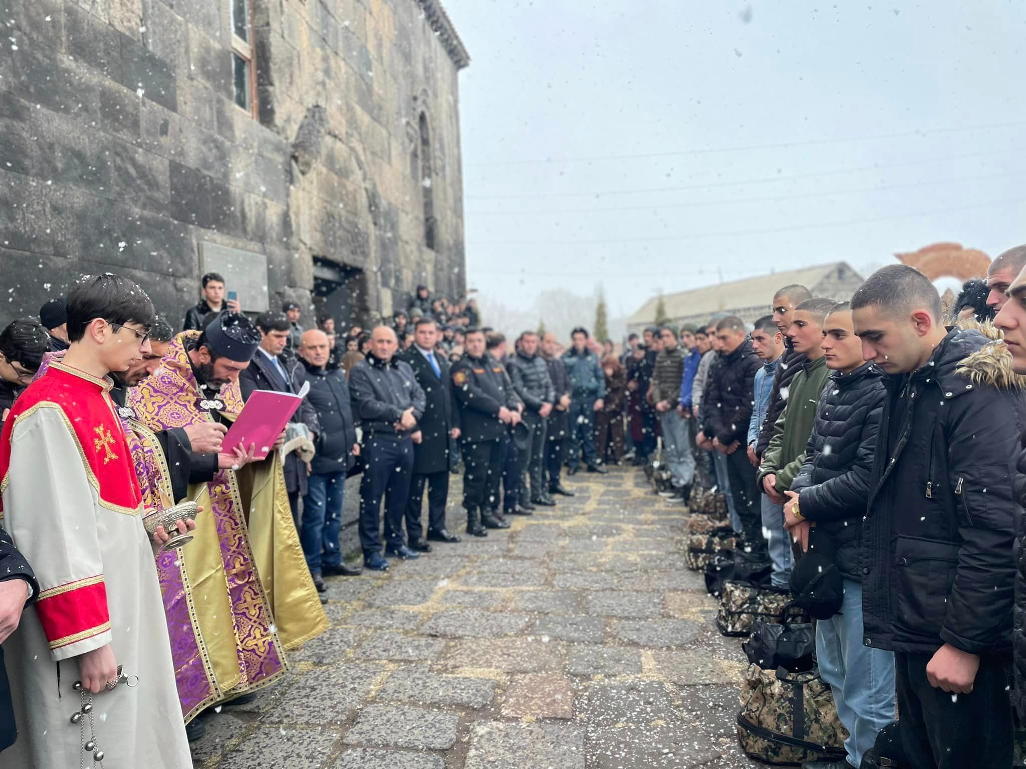 Ապարանի Սուրբ Խաչ եկեղեցու բակում հոգևոր հայրեր Տեր Սարգիս քահանա Սարգսյանը և Տեր Հայկ քահանա Քոչարյանը օրհնության կարգ կատարեցին` բարի և անփորձանք ծառայություն մաղթելով նորակոչիկներին: