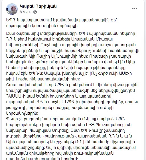 ԵՊՀ-ն պատրաստվում է լայնածավալ պատերազմի՞, թե՞ միջազգային կոռուպցիոն գործարքի: Այս մասին ֆեյսբուքյան իր էջում գրում է իրավապաշտպան Կարեն Հեքիմյանը․