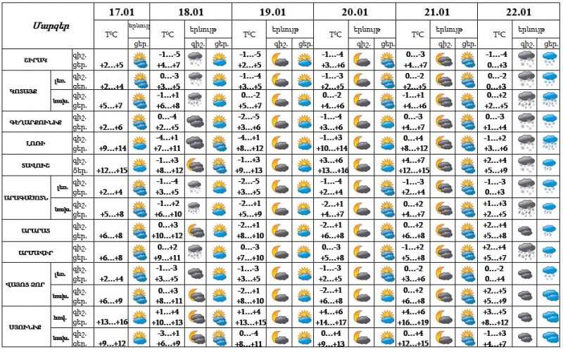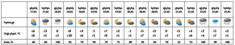 Հունվարի 17-ի և 18-ի ցերեկը, 19-21-ին սպասվում է առանց տեղումների եղանակ։ Հունվարի 17-ի երեկոյան և 18-ի գիշերը հնարավոր են թույլ տեղումներ, 22-ին սպասվում են տեղումներ։