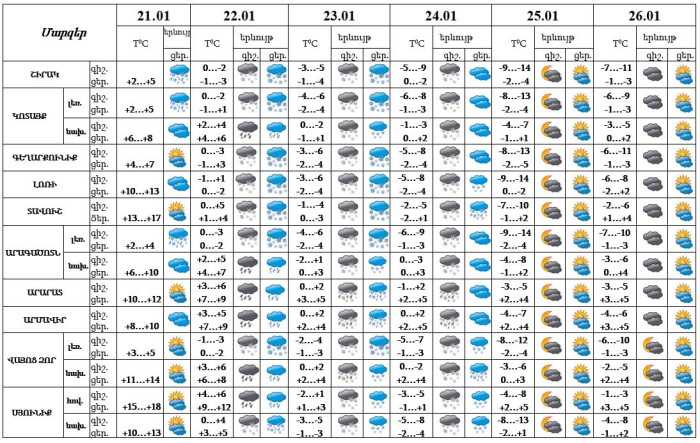 Հունվարի 24-ի ցերեկը առանձին շրջաններում, 22-23-ին, 24-ի գիշերը շրջանների մեծ մասում սպասվում են տեղումներ, լեռնային և նախալեռնաային շրջաններում՝ ձյուն և մառախուղ։ Հունվարի 22-ի ցերեկը, 23-ին առանձին հատվածներում՝ ինտենսիվ, սպասվում է նաև բուք, ճանապարհներին՝ մերկասառույց։ Հունվարի 25-26-ին սպասվում է առանց տեղումների եղանակ։ Քամին՝ հյուսիսարևելյան 3-6 մ/վ, հունվարի 22-23-ին առանձին վայրերում սպասվում է քամու ուժգնացում 14-18մ/վ արագությամբ: Օդի ջերմաստիճանը հունվարի 22-ի ցերեկը, 23-ին աստիճանաբար կնվազի 7-9, Լոռիում, Տավուշում, Սյունիքում 14-16 աստիճանով։