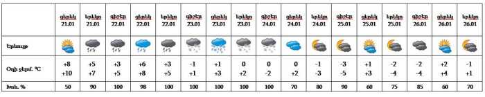 Հունվարի 22-23-ին, 24-ի գիշերը սպասվում են տեղումներ և մառախուղ, 23-ին 24-ի գիշերը՝ ձյուն։ Հունվարի 24-ի ցերեկը, 25-26-ին սպասվում է առանց տեղումների եղանակ։