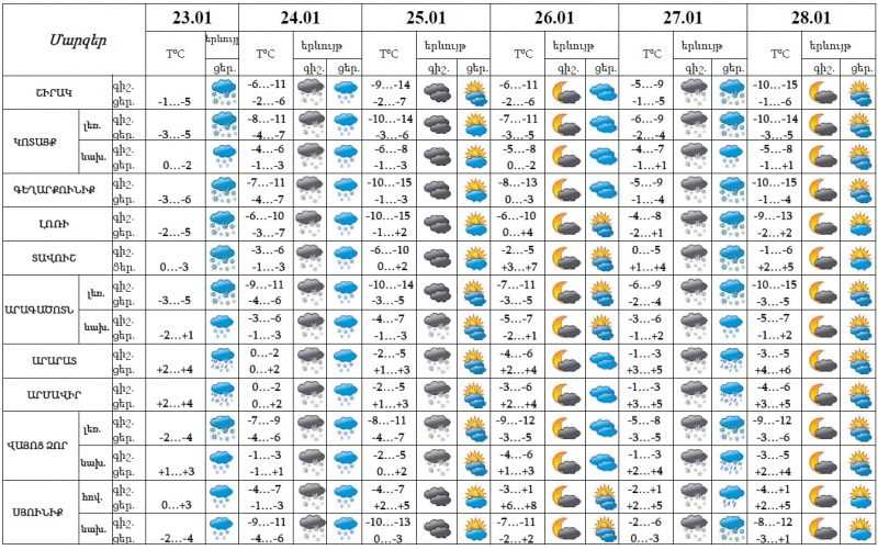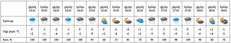 Հունվարի 23-ի ցերեկը, 24-ին, 25-ի գիշերը, 26-ի ուշ երեկոյան, 27-ին սպասվում է ձյուն։ Հունվարի 25-ի ցերեկը, 26-ի գիշերը, 28-ին սպասվում է առանց տեղումների եղանակ։