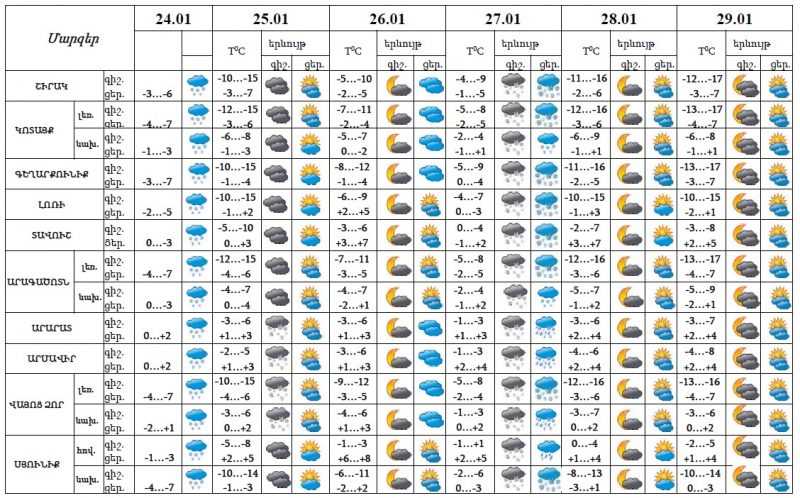 Հունվարի 24-ի ցերեկը, 27-ին հանրապետության ողջ տարածքում, 25-ի գիշերը, 26-ի երեկոյան ժամերին առանձին շրջաններում սպասվում է ձյուն։ Հունվարի 24-ի ցերեկը, տեղումները առանձին հատվածներում կլինեն ինտենսիվ, լեռնային առանձին շրջաններում սպասվում է նաև բուք, մառախուղ, ճանապարհներին՝ մերկասառույց։ Հունվարի 25-ի ցերեկը, 26-ի գիշերը, 28-29-ին սպասվում է առանց տեղումների եղանակ։