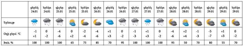 Հունվարի 24-ի ցերեկը, 25-ի գիշերը, 26-ի ուշ երեկոյան, 27-ին սպասվում է ձյուն։ Հունվարի 25-ի ցերեկը, 26-ի գիշերը, 28-29-ին սպասվում է առանց տեղումների եղանակ։