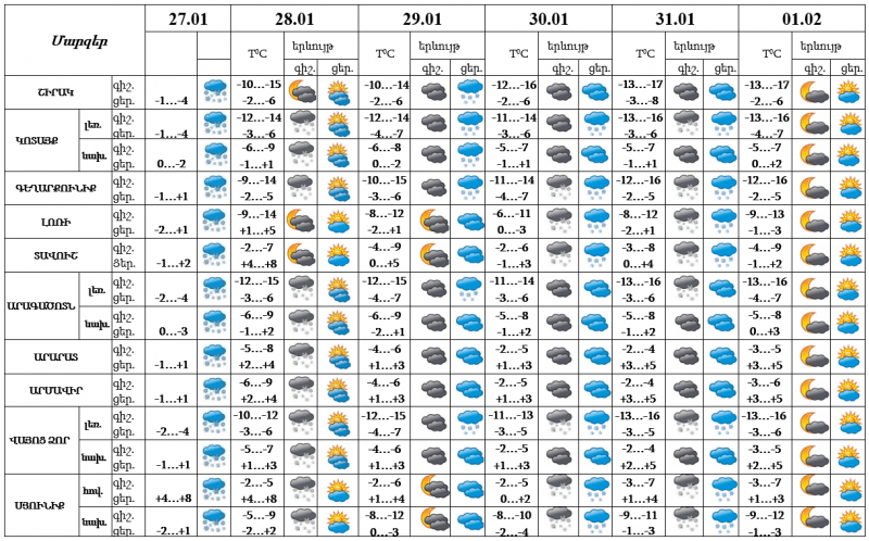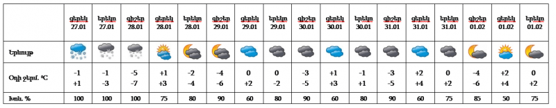 Հունվարի 27-ի ցերեկը հանրապետության ողջ տարածքում, 28-ի գիշերը, 29-31-ին առանձին շրջաններում սպասվում է ձյուն, լեռնային առանձին շրջաններում բուք։ Հունվարի 28-ի ցերեկը, փետրվարի 1-ին սպասվում է առանց տեղումների եղանակ։ Քամին՝ հյուսիս-արևմտյան 2-5մ/վ, 27-ին առանձին վայրերում սպասվում է քամու ուժգնացում 14-18մ/վ արագությամբ: Օդի ջերմաստիճանը հունվարի 28-ի գիշերը կնվազի 5-6 աստիճանով։