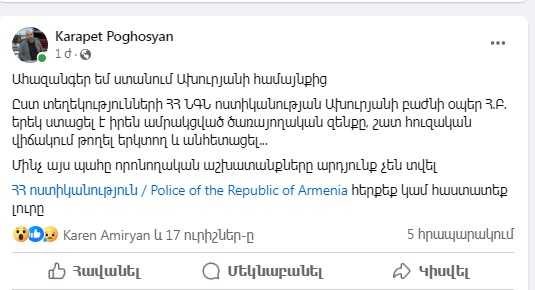 Իրավապաշտպան Կարապետ Պողոսյանը ֆեյսբուքյան իր էջում գրում է. «Ահազանգեր եմ ստանում Ախուրյանի համայնքից: Ըստ տեղեկությունների՝ ՀՀ ՆԳՆ ոստիկանության Ախուրյանի բաժնի օպեր Հ. Բ-ն երեկ ստացել է իրեն ամրակցված ծառայողական զենքը, շատ հուզական վիճակում թողել երկտող և անհետացել…
