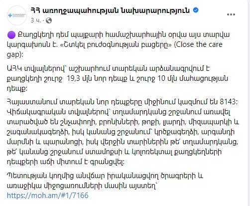 Փետրվարի 4-ը քաղցկեղի դեմ պայքարի համաշխարհային օրն է. այս տարվա կարգախոսն է. «Շտկել բուժօգնության բացերը» (Close the care gap):