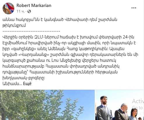 Վերջին օրերին ԶԼՄ-ներում հաճախ է խոսվում փետրվարի 24-ին Էջմիածնում հրավիրված ինչ-որ ակցիայի մասին, որի նպատակն է իբր «գահընկեց» անել Ամենայն Հաոց կաթողիկոսին: Այսպես կոչված «Վարդանանք» շարժման գլխավոր դերակատարներն են մի կարգալույծ քահանա ու Լոս Անջելեսից վերջերս հատուկ հանձնարարությամբ Հայաստան փոխադրված անդրանիկ դովլաթյանը՝ Հայաստանի իշխանությունների հերթական խեղկատակ-բլոգերը: Այս մասին ֆեյսբուքյան իր էջում գրել է քաղաքագետ-իրավաբան Ռոբերտ Մարգարյանը: