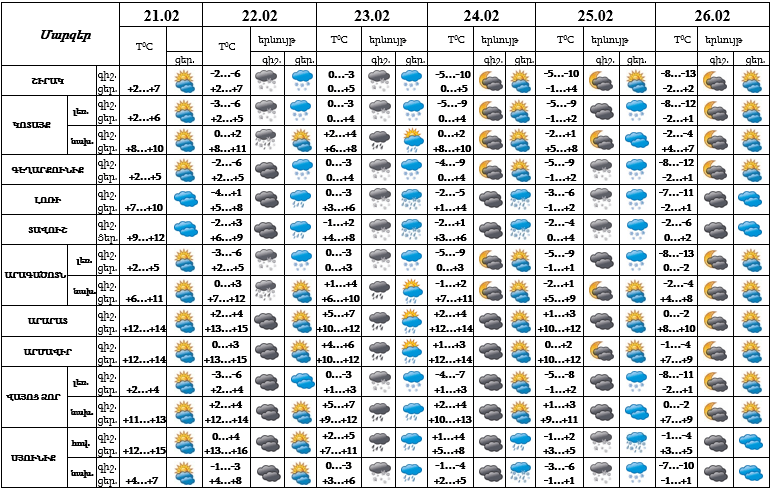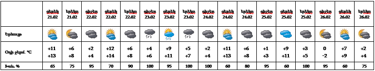 Փետրվարի 21-ի ցերեկը, 26-ին սպասվում է առանց տեղումների եղանակ։ Փետրվարի 22-25-ին առանձին շրջաններում սպասվում են տեղումներ և մառախուղ, լեռնային շրջաններում՝ ձյուն: