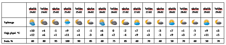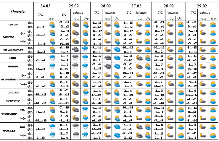 Փետրվարի 24-ի ցերեկը շրջանների զգալի մասում, 25-26-ին առանձին շրջաններում սպասվում են տեղումներ և մառախուղ, լեռնային շրջաններում՝ ձյուն: Փետրվարի 27-29-ին սպասվում է առանց տեղումների եղանակ։