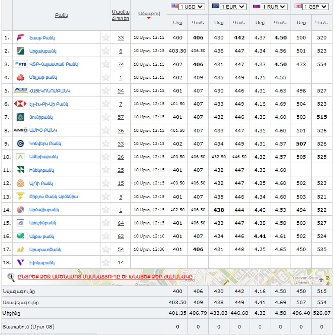 Հայաստանի Հանրապետության առևտրային բանկերը մարտի 10-ին ԱՄՆ դոլարը գնում են 401.35 դրամ միջին կշռված գնով և վաճառում 406.79 դրամով, տեղեկանում ենք Rate.am կայքից:
