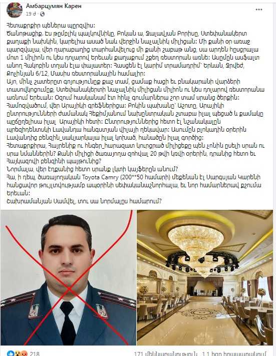 Այո, մինչ շատերըտ գոյությունըք քաշ տամ, ցամաք հացի եւ բնակարանի վարձերի տասովկոցումըք, Ստեփանակերտի նաչալնիկ միլիցան միլիոն ու կես դոլարով ռեստորանա առնում Երեւան։ Օզում հասկանամ էտ հինչ գումարներա շոր տամ սրանց ծերքին։ Համոզվածում, վեր Արայիկի գրեֆներիցա։ Բոկին պախանը` Աշոտը, Արայիկի ընտրությունների ժամանակ Հեքիմյանում նախընտրական շտաբա իլալ պեցած և քամակը պըճըղելիսա իլալ Արայիկի հետի։ Ընտրություններից հետո էլ նշանակալըն պրեզիդենտսկի Լավանդա հանգստյան վիլայի ղեկավար։ Ասումըն բլոկադին օրերին Լավանդից բենզին_սակյարկայա իլալ կոխած, հանածըն իլալ գործից։