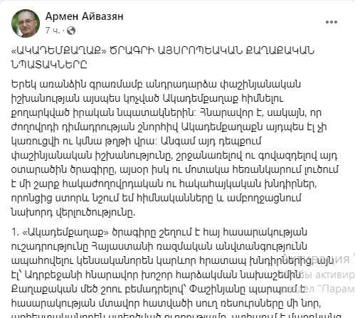 ՀՀ-ում Ակադեմիական քաղաքի հիմնումն օտար, թշնամական ծրագիր է, որի իրական նպատակներից ստորև նշում եմ միայն 10 հիմնականը.