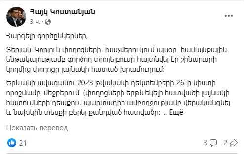 Երևանի ավագանու 2023 թվականի դեկտեմբերի 26-ի նիստի  որոշմամբ, մեջբերում  (փողոցների երթևեկելի հատվածի լայնակի հատումների դեպքում պարտադիր ամբողջությամբ վերականգնել և նախկին տեսքի բերել քանդված հատվածը: