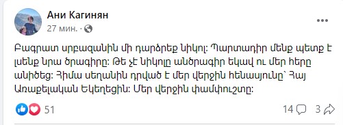 Բագրատ սրբազանին մի դարձրեք նիկոլ: Պարտադիր մենք պետք է լսենք նրա ծրագիրը: Թե չէ նիկոլը անծրագիր եկավ ու մեր հերը անիծեց: Հիմա սեղանին դրված է մեր վերջին հենասյունը` Հայ Առաքելական Եկեղեցին: Մեր վերջին փամփուշտը: