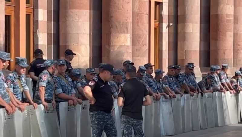 Հանրապետության հրապարակում Բագրատ Սրբազանի առաջնորդած շարժման հանրահավաքին ընդառաջ կառավարության շենքի մոտ ոստիկանները վահաններով պատ են կազմել։