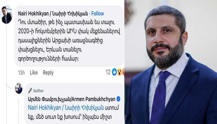 Երևանի քաղաքապետի առաջին տեղակալ Արմեն Փամբուխչյանի ֆեյսբուքյան գրառումը․ «Բլոգեր կամ չգիտեմ ինչ Նաիրի Հոխիկյանն իմ ֆեյսբուքյան գրառումներից մեկի տակ գրել է, իբրև ես 2020-ի հոկտեմբերին ԱԻՆ փակ մեքենաներով Արցախի առաջնագծից փախցրել եմ դասալիքներին և տեղափոխել Երևան։