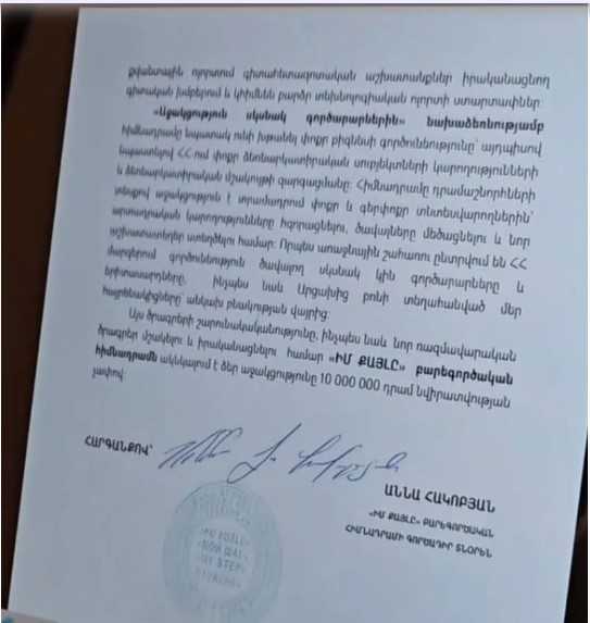 Պահանջը ձևակերպվել էր որպես «Իմ Քայլը» հիմնադրամի բարեգործական ծրագրերին աջակցելու ԱԿՆԿԱԼԻՔ։ Եվ ահա այսօր Աննա Հակոբյանը հաստատել է մեր տեղեկությունը՝ անուղղակի կերպով հրապարակելով իր այդ «նամակ-ակնկալիքը»։ Իհարկե, մենք հիմա չենք կարող հստակ ասել, թե ի՞նչ նպատակով է Հակոբյանը որոշել հանրայնացնել ՀՀ խոշոր ձեռնարկատիրություններից ունեցած իր՝ տասնյակ միլիոնավոր դրամների հասնող ակնկալիքները։
