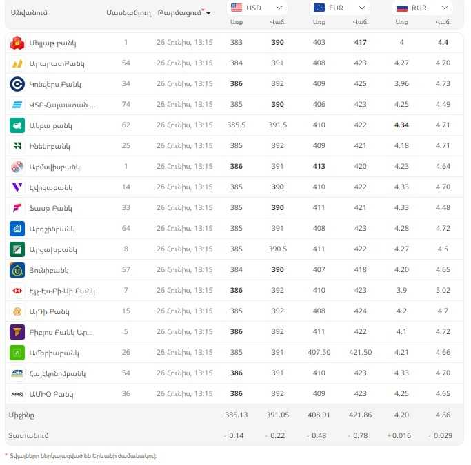 Հայաստանի առևտրային բանկերը հունիսի 26-ին ԱՄՆ դոլարը գնում են 385,36 դրամ միջին գնով և վաճառում 391,30 դրամով, տեղեկանում ենք Rate.am կայքից:
