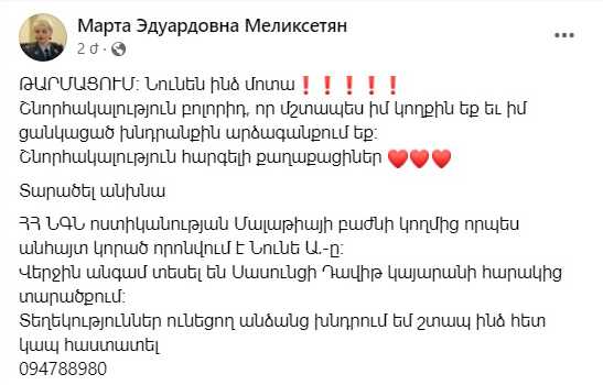 «Նունեն ինձ մոտ է»,- այս մասին ֆեյսբուքյան իր էջում գրել է Մալաթիայի ոստիկանության անչափահասների բաժնի պետ Մարթա Մելիքսեթյանը, ով ավելի վաղ հայտնել էր աղջկա անհետ կորելու մասին։