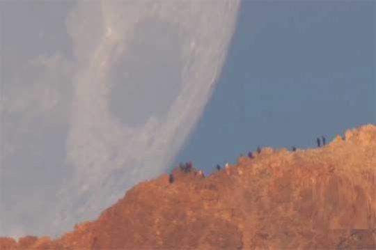 Տպավորիչ տեսարանը նկարահանվել է Կանարյան կղզիների լեռներում։ Նկարահանումը կատարվել է 16 կիլոմետր հեռավորության վրա՝ երկարաֆոկուս օբյեկտիվի օգնությամբ։ Դրա հաշվին, թվում է, լուսինը լեռան չափսին է, իսկ մարդիկ՝ չափազանց փոքր։