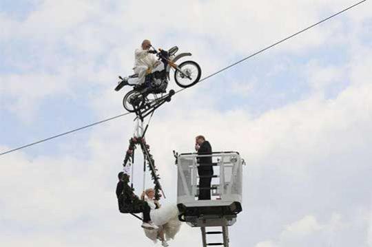 Հարսանիքը տեղական փառատոնի մի մասն է դարձել։ Պարանը ձգված է եղել քաղաքային պատի և աշտարակի միջև։ Մոտոցիկլետի ղեկին նստած է եղել էքվիլիբրիստ Ֆալկո Թրաբերը։