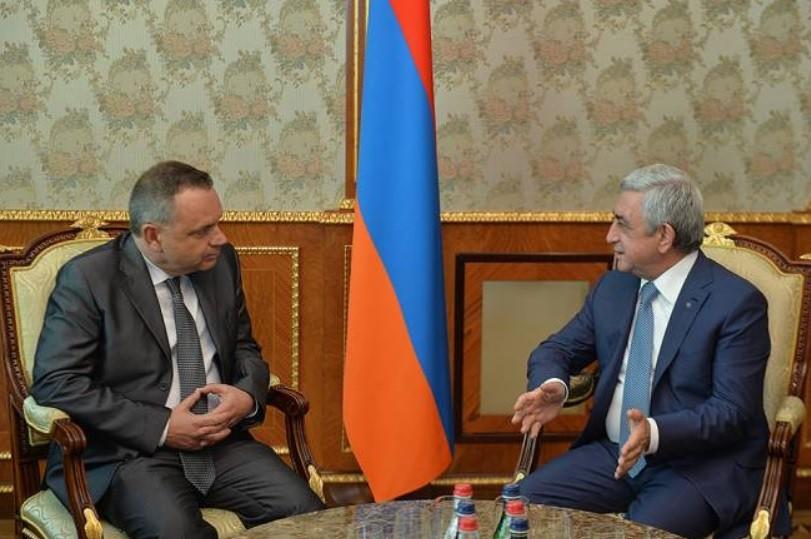 Սարգսյանը շնորհակալություն է հայտնել դեսպան Շարպանտիեին Հայաստանում պաշտոնավարման անցած երեք տարիներին հավատարիմ բարեկամ և դաշնակից Ֆրանսիայի հետ մեր երկրի բարեկամության ամրապնդման գործում նրա ներդրած ջանքերի և այդ կարճ ժամանակահատվածում հատկապես միջպետական հարաբերությունների տնտեսական բաղադրիչի զարգացմանն արդյունավետ գործունեությամբ նպաստելու համար։ Քաղաքական ակտիվ երկխոսությանը զուգահեռ տնտեսական փոխգործակցության խորացմանը միտված աշխատանքի արդյունքները, Նախագահ Սարգսյանի համոզմամբ, ակնառու են և առարկայական. դրանք արտահայտվում են ինչպես Հայաստանում Զարգացման ֆրանսիական գործակալության ակտիվ գործունեությամբ, տարբեր ոլորտներում ֆրանսիական կապիտալի ներդրմամբ իրականացվող ծրագրերով, որոնցից են՝ Վեդիի ջրամբարի կառուցման կարևոր ծրագիրը, «Վեոլիա» ընկերության գործունեությունը և այլն: