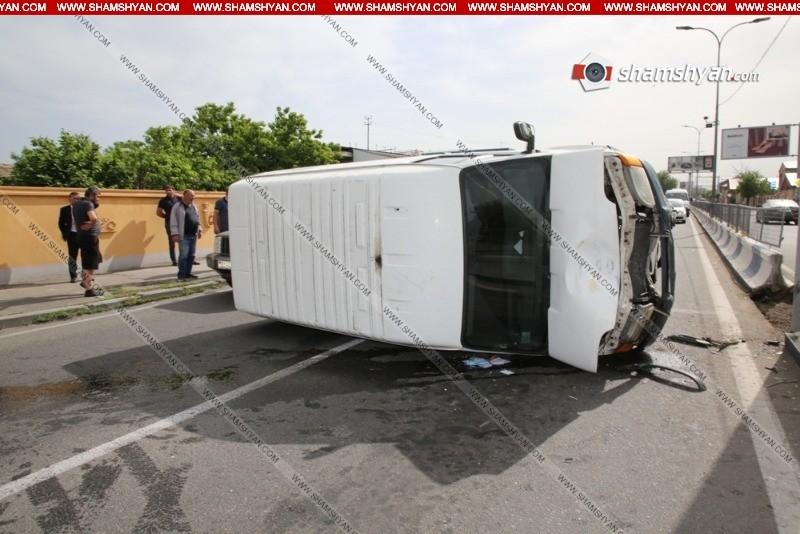 ՖՈՏՈ. Խոշոր ավտովթար Երևանի «Զվարթնոց» օդանավակայանի խաչմերուկում. Ford Transit-ը բախվել է բետոնե արգելապատնեշին ու երկաթե գովազդային վահանակին և կողաշրջվել 26.05.2019
