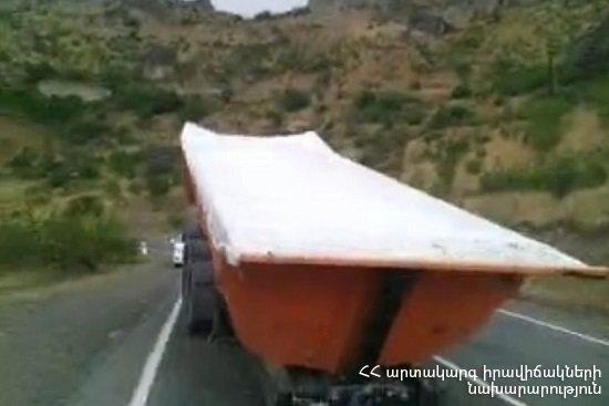 ՏԵՍԱՆՅՈՒԹ. Գորիս-Կապան ճանապարհին բեռնատարի կցորդն առանձնացել է եւ միակողմանի փակել երթեւեկությունը 14.07.2019
