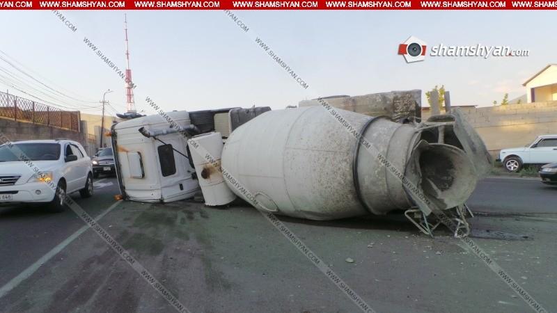ՖՈՏՈ. Խոշոր ավտովթար Երևանում. հեռուստաաշտարակի հարևանութամբ Skania մակնիշի ցեմենտ տեղափոխող բեռնատարը կողաշրջվել է 16.07.2019