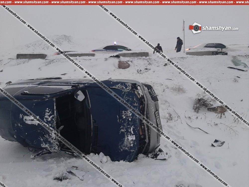 ՖՈՏՈ. Ճանապարհի մերկասառույցի պատճառով 22–ամյա վարորդը Mitsubishi-ով բախվել է արգելապատնեշներին և կողաշրջվել. կան վիրավորներ 04.02.2020