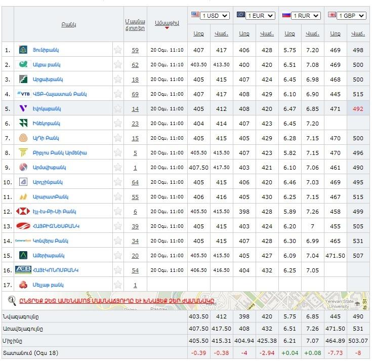 Согласно этим данным, с утра 20 августа коммерческие банки страны скупают доллар США по средневзвешенной цене в 405,50 драмов, понизившись в цене в сравнении с предыдущим рабочим днем на 0,39 драмов. Продажа американской валюты производится по средневзвешенной цене в 415,31 драм, или на 0,38 драмов меньше, чем днем ранее.