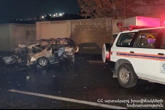 Ночью 28 декабря, в 03: 09, в Национальный центр управления кризисными ситуациями поступил сигнал о том, что на проспекте Исакова в Ереване, возле полицейской академии, автомобиль врезался в электрический столб и загорелся, сообщает МЧС Армении.