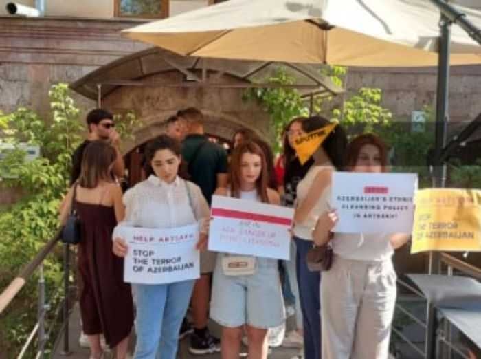 У офиса МККК в Ереване проходит акция карабахской молодежи с требованием к председателю организации Мирьяне Сполярич-Эггер освободить похищенного азербайджанской стороной Вагифа Хачатряна.