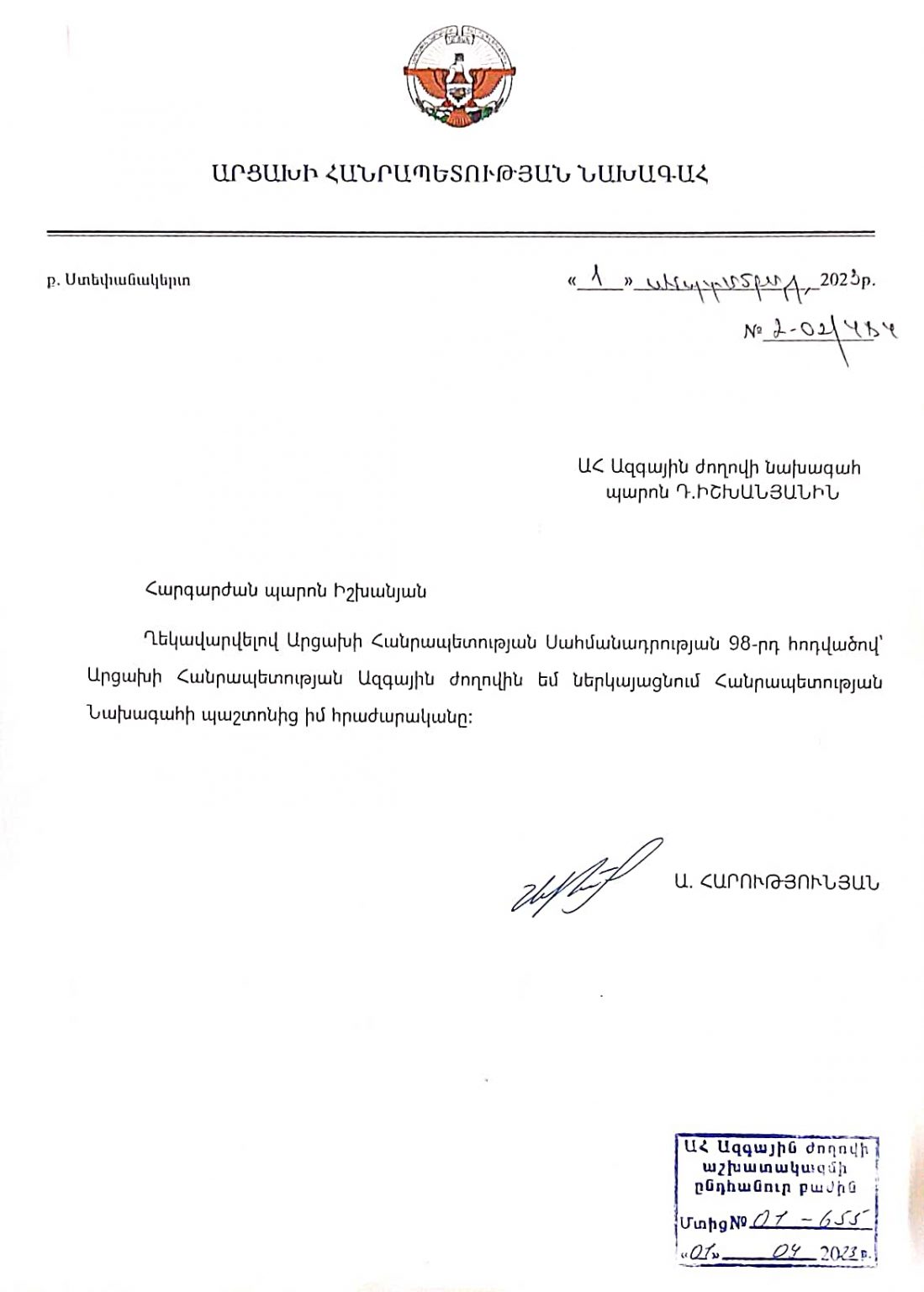 Президент Арцаха Араик Арутюнян подал в парламент республики заявление об отставке. Об этом Armlife.am сообщили в пресс-службе НС Арцаха.